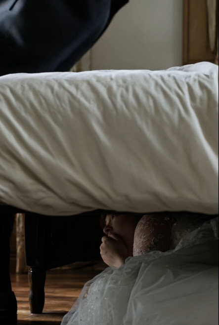 Dok je zamišljala trenutak kada će ga iznenada izvući iz svakodnevnog umora, sanjajući o smijehu i ljubavnoj idili, nije mogla ni pretpostaviti šta će se dogoditi. Skrivajući se ispod kreveta, osjetila je kako se prašina i neudobnost skupljaju oko nje. Bijela vjenčanica, koja je trebala simbolizirati novi početak, sada je bila izgužvana, pritisnuta na hladnom podu. Čipka se zakačila za tepih, a til ju je stegnuo oko nogu, ali mlada je bila odlučna da izdrži. U njenoj mašti, ona je bila glavna junakinja romantične priče, a Alex je bio njen vitez u sjajnom oklopu, ne sluteći šta se zapravo odvija ispod kreveta.